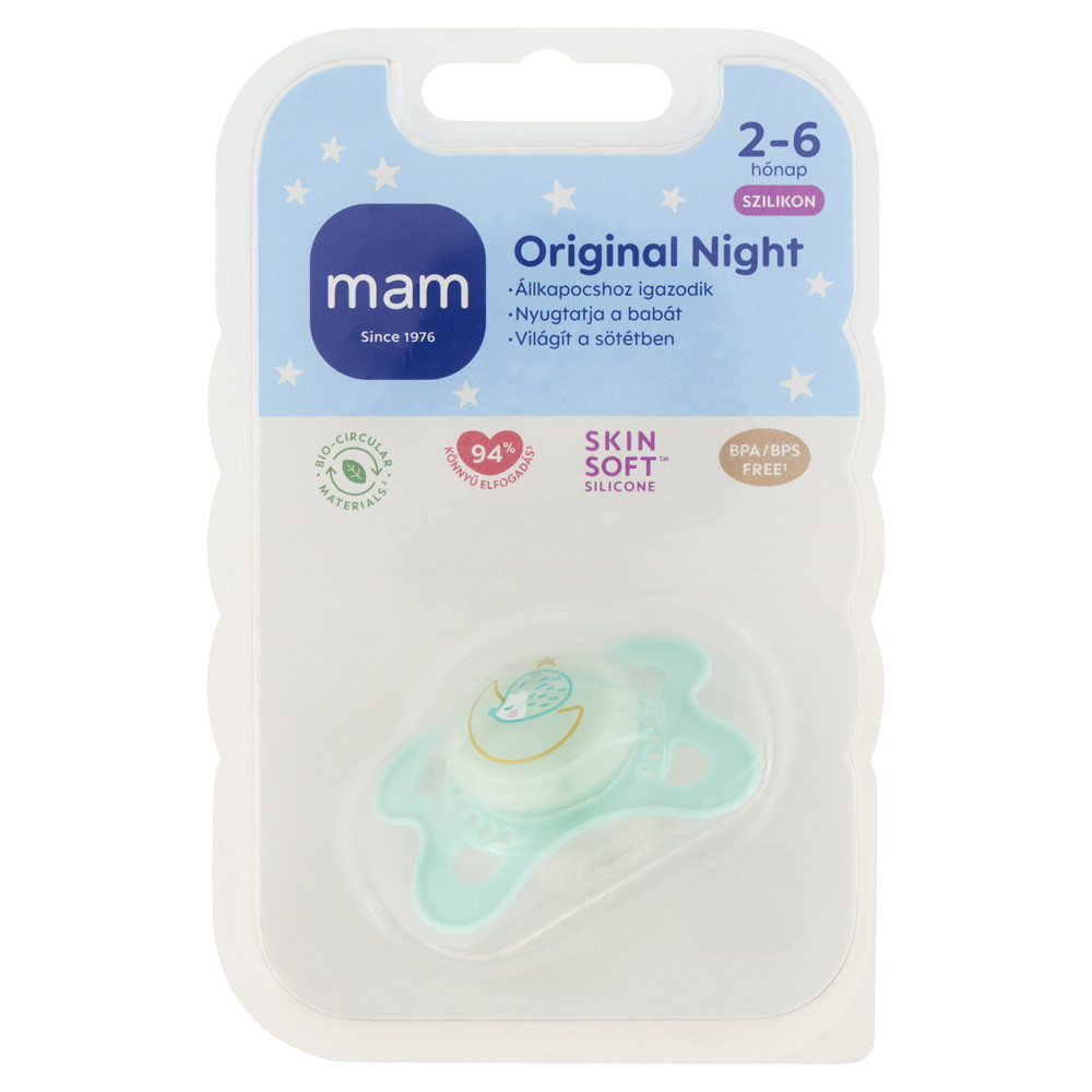 Üdvözlünk a fenntarthatóbb babatermékek új korszakában: Bio-körforgásos PPA fenntarthatóságot a következõ szintre emeljük.A bio-körforgásos PP ugyanazokat a nagyszerû elõnyöket kínálja, mint a fosszílis PP, a MAM magas szintû gyártási szabványait és sterilizálási követelményeit figyelembe véve.Mit lehet tudni a bio-körforgásos PP-rõl?Második generációs alapanyag: -új életet adunk egy használt anyagnak.-a bio-körforgásos PP (polipropilén) második generációs megújuló alapanyagból készül, -100%-ban visszavezethetõ bio-körforgásos nyersanyagokra.Sötétben világító cumi – könnyû megtalálni, mert a gombja világítA nagyméretû levegõnyílásoknak és az egyedülálló MAM belsõ mélyedéseknek köszönhetõen kíméli a bõrt- Ortodontikus- MAM SkinSoft™ szilikonnal vagy természetes gumival kapható- Megnyugtatja és megvigasztalja a babátBPA, BPS-mentes- Fontos! A termék egészségvédelmi és higiéniai terméknek minõsül. Amennyiben a csomagolás felbontásra került, vagy a kipróbálás jelei látszódnak a terméken, úgy a 14 napos elállási jog érvényét veszíti a 45/2014. (II. 26.) korm. rendelet 29. § (1) bekezdése alapján.