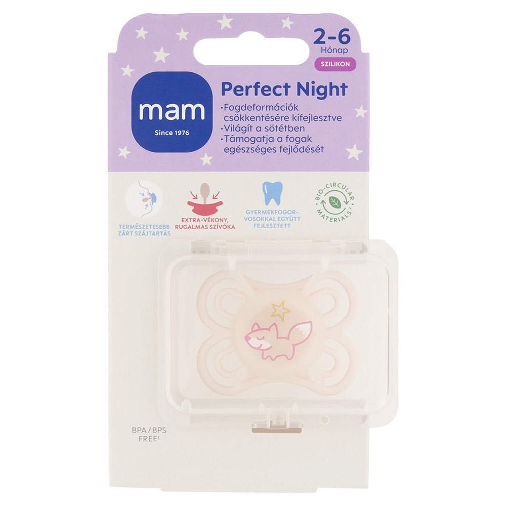 Üdvözlünk a fenntarthatóbb babatermékek új korszakában: Bio-körforgásos PPA fenntarthatóságot a következõ szintre emeljük.A bio-körforgásos PP ugyanazokat a nagyszerû elõnyöket kínálja, mint a fosszílis PP, a MAM magas szintû gyártási szabványait és sterilizálási követelményeit figyelembe véve.Mit lehet tudni a bio-körforgásos PP-rõl?Második generációs alapanyag: -új életet adunk egy használt anyagnak.-a bio-körforgásos PP (polipropilén) második generációs megújuló alapanyagból készül, -100%-ban visszavezethetõ bio-körforgásos nyersanyagokra.A fogak rendellenes állásának megakadályozására fejlesztették ki.BPA mentesJellemzõi:- a fogógomb világít a sötétben- a MAM Perfect megoldást hozott a kutatók által tudományosan bizonyított tényre: a cumi használata befolyásolja a baba állkapcsának és a fogainak fejlõdését- a MAM megoldás: szuper lágy, extra vékony cumi- a cumi nyak része csak 2.28mm- önsterilizáló- a cumi 3-szor puhább és rugalmasabb, mint a hagyományos cumik, ily módon a MAM Perfect optimálisan támogatja az egészséges fejlõdését az állkapocsnak és a fogaknak.- Fontos! A termék egészségvédelmi és higiéniai terméknek minõsül. Amennyiben a csomagolás felbontásra került, vagy a kipróbálás jelei látszódnak a terméken, úgy a 14 napos elállási jog érvényét veszíti a 45/2014. (II. 26.) korm. rendelet 29. § (1) bekezdése alapján.