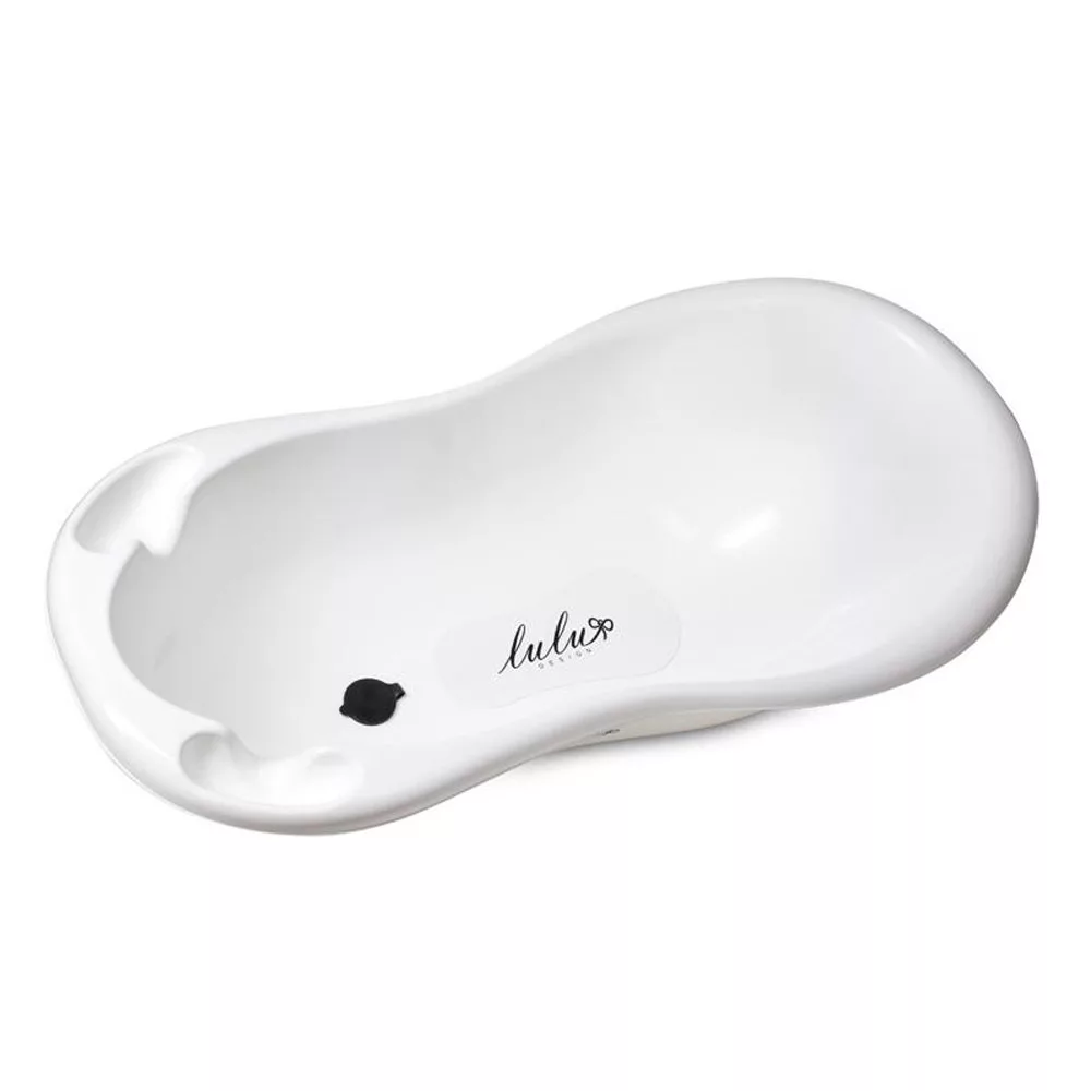 A kád leeresztödugóval, csúszásmentes szönyeggel és Lulu grafikai motívummal 100 cm hosszú.