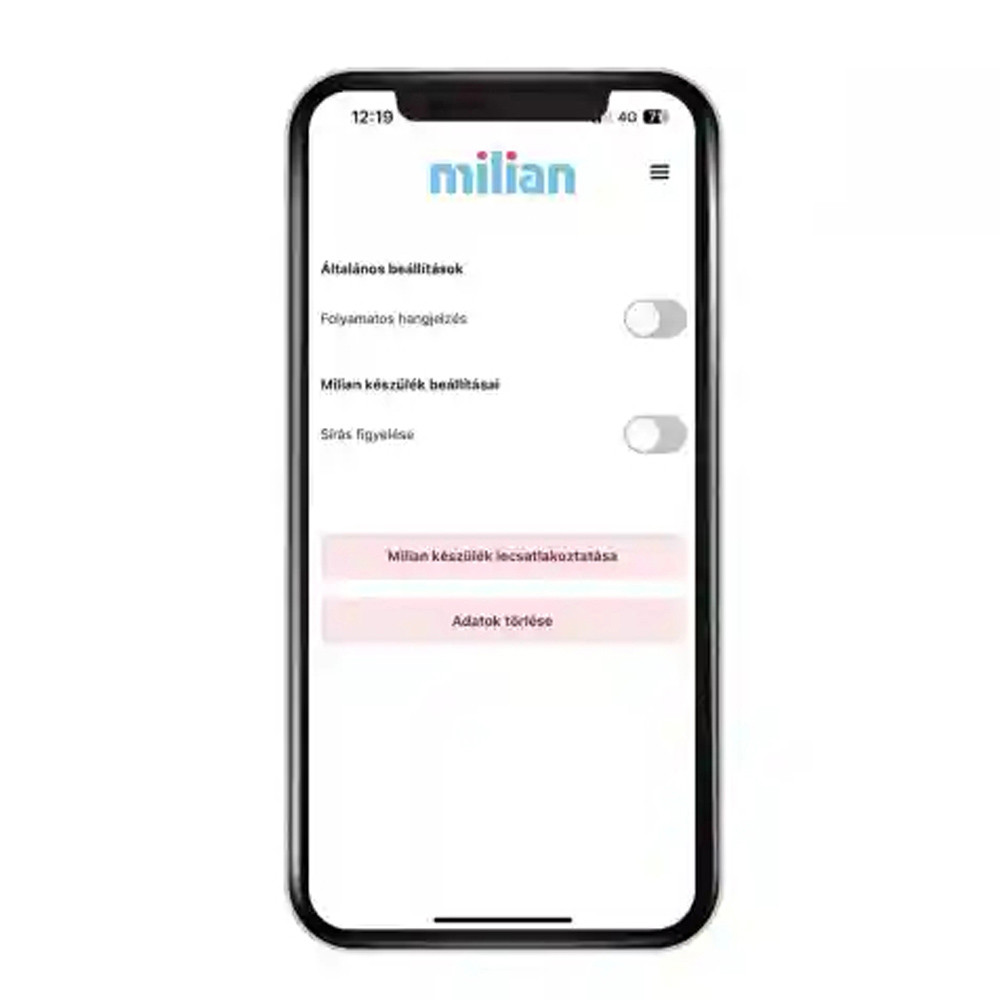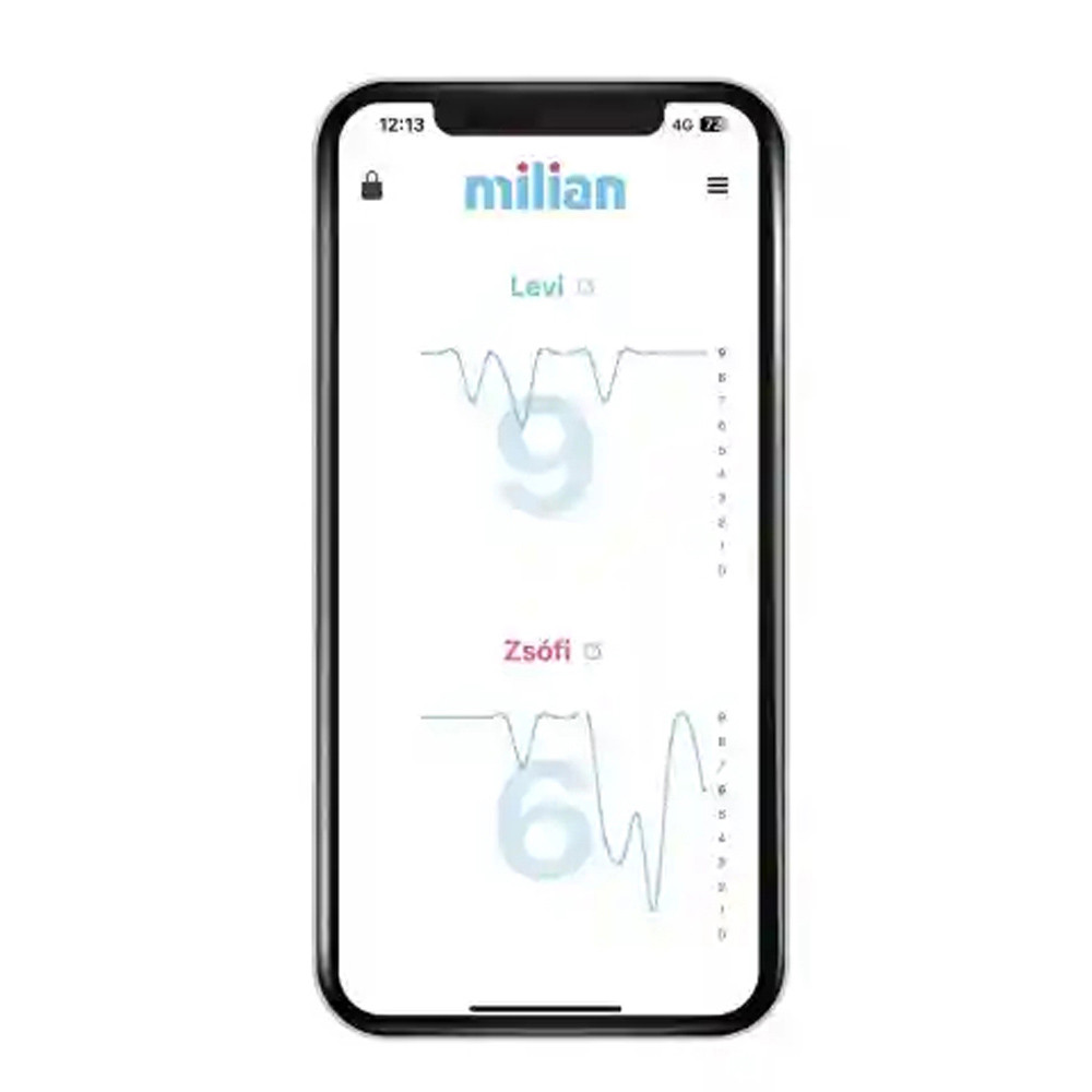 Milian Lite Bluetooth új generációs légzésfigyelõ, 2 érzékelõlappalModern, letisztult megjelenés.Korszerû, magas színvonalú magyar termék.A 2 db nagyméretû érzékelõlap lehetõvé teszi egy 60×120 cm-es kiságy teljes fekvõfelületének biztonságos figyelését, de 1 érzékelõlapot használva babafészek alá vagy bölcsõbe is ajánljuk. A két érzékelõlap megosztva is használható pl. egyik a kiságyban másik a bölcsõben – ilyenkor a központi egység egyszerûen lecsatolható és áthelyezhetõ.Bõvíthetõ plusz 1-2 érzékelõlappal (a további érzékelõlapok külön vásárolhatók meg).FIGYELEM! A KISÁGYBAN ÉS ANNAK KÖZVETLEN KÖRNYEZETÉBEN BIZTONSÁGI OKOKBÓL TÖLTHETÕ ELEM, AKKUMULÁTOR HASZNÁLATA NEM JAVASOLT! (pl. töltés közbeni áramütés, akkumulátortûz veszélye)Milian Lite Bluetooth új generációs légzésfigyelõ és alvásmonitor érzékelõlappal.Milian App tulajdonságai: Milian App – iOS (Letölthetõ az alábbi országokból: HU, SK, CZ, PL)Milian App – Android Minimum rendszerkövetelmény: iOS 9 vagy Android 9 A Bluetooth hatótávolsága épülettõl függõen ~15 méter. Az applikáció kizárólag a ‘Milian Pro Bluetooth’ vagy ‘Milian Lite Bluetooth’ típussal együtt mûködik! A ‘Milian Lite’ és ‘Milian Pro’ típusok önmagukban nem tartalmaznak bluetooth csatlakozási lehetõséget! Milian App funkciói: Egész éjszakás alvásmonitor Folyamatos grafikon nézet Elõzmények visszakeresése korlátlan ideig Bekapcsolható halk visszajelzés a mûködésrõl Figyelmeztetés bluetooth kapcsolat megszakadása esetén RiasztásMilian Lite Bluetooth légzésfigyelõ tulajdonságai (applikáció nélkül is):Alapfunkciók:– mozgás- és légzésfigyelés, 12 másodperc légzéskimaradás esetén hangjelzés (készülék 3 rövid hangjelzéssel próbálja a babát erõteljesebb mozgásra késztetni), 18 másodperc után riasztás– kijelzi a mozgás erõsségét, nagyméretû hétszegmenses digitális kijelzõn– a matracon keresztül is érzékel, bármilyen típusú matrac alatt elhelyezhetõHasznos tulajdonságok:– 12 perc eseménymemória: a riasztás elõtti 12 perc visszanézhetõ– variálható számú (1-4) nagyméretû érzékelõlap (30×50 cm) csatlakoztatható– érzékelõlapok fokozott oldalirányú érzékenysége– akár extra nagy megfigyelt terület, vagy több fekhely közt megosztható elhelyezés (1-nél több érzékelõlap esetén)– a központi egység rögzítése különlegesen erõs tépõzárral, ugyanakkor könnyen lecsatolható , egyszerû a babával vinni másik fekhelyhez.– Hosszú idejû mûködés 2db ceruzaelemmel (2-3 hónap). Aktív Bluetooth használat esetén az elemcsere periódus lecsökkenhet!Okos funkciók:– intelligens elemfeszültség figyelés (akkor jelez elemcserét, amikor a baba már nem alszik)– környezeti zavaró mozgások kiszûrése a beállítható érzékelési küszöbszinttel– szoftveres megoldások a biztonságos érzékelés érdekében– be- és kikapcsolás biztonsági hangjelzéssel vagy hangjelzés nélkül– egyszerû, egygombos kezelés: telepítés után a használat során csak ki és bekapcsolás, a többirõl a készülék gondoskodikA termékhez lehet vásárolni több érzékelõlapot, ha szükséges – olvassa el errõl a használati útmutatót!– 5 év jótállás: 2 év csere 3 év gyártói jótállásCE jelölés:– A készülék megfelel az EU-s irányelveknek és rendeleteknek.