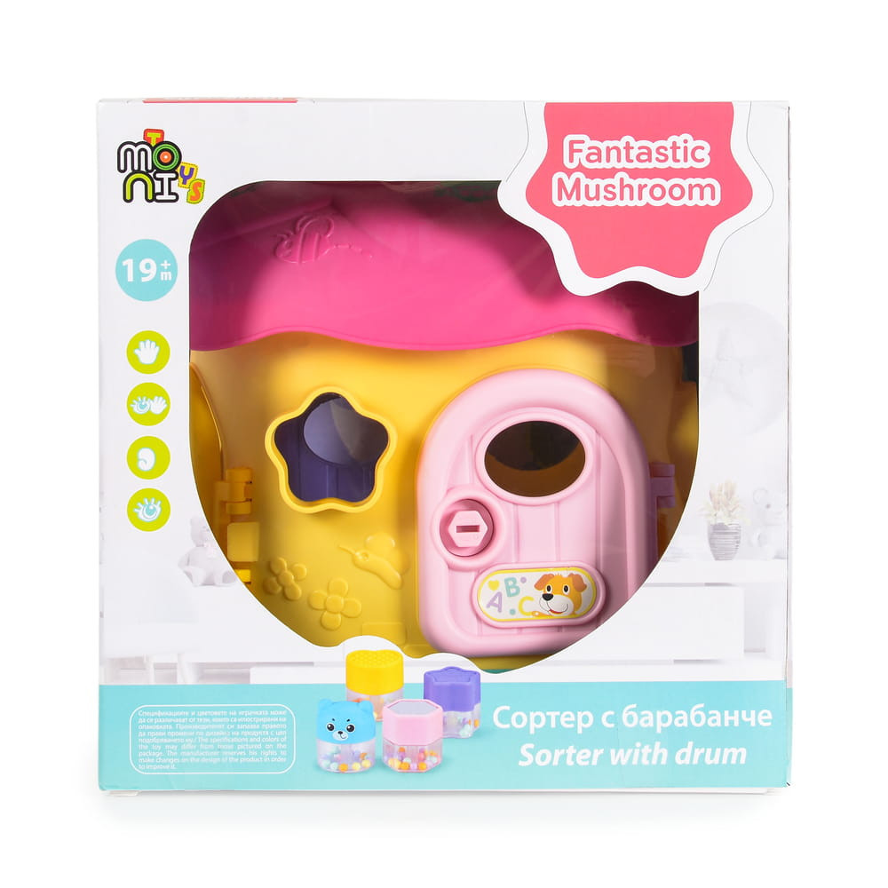 Gombaházikó formaberakóval és dob funkcióval., a formákat bedobva különböző hangokat ad. 19 hónaposnál idősebb gyermekek számára alkalmas.