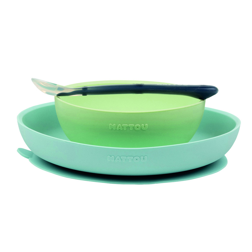 A Nattou háromrészes, puha szilikonból készült étkészlete nagyon praktikus, könnyen megfogható és csúszásgátlós. A tálak lekerekített belsõ szélei megkönnyítik az ételek felvételét.Jellemzõk:- az étkészlet puha, rugalmas szilikonból készült, amely leeséskor nem törik el.- a tapadókorongos tál, könnyen tapad az asztal vagy a gyermek étkezõszék felületéhez (a tapadókorong megfelelõ rögzítéséhez a felületnek tisztának kell lennie).- a készlet alkalmas mind a 4 hónapos gyermek az elsõ étkezéséhez, mind a 12-36 hónapos idõsebb gyermekek számára, akik önállóan tanulnak enni.- méretek: tál - átmérõ 19 cm, tál – átmérõ 13 cm, kanál - hossza 16 cmAnyaga: BPA-mentes szilikon.