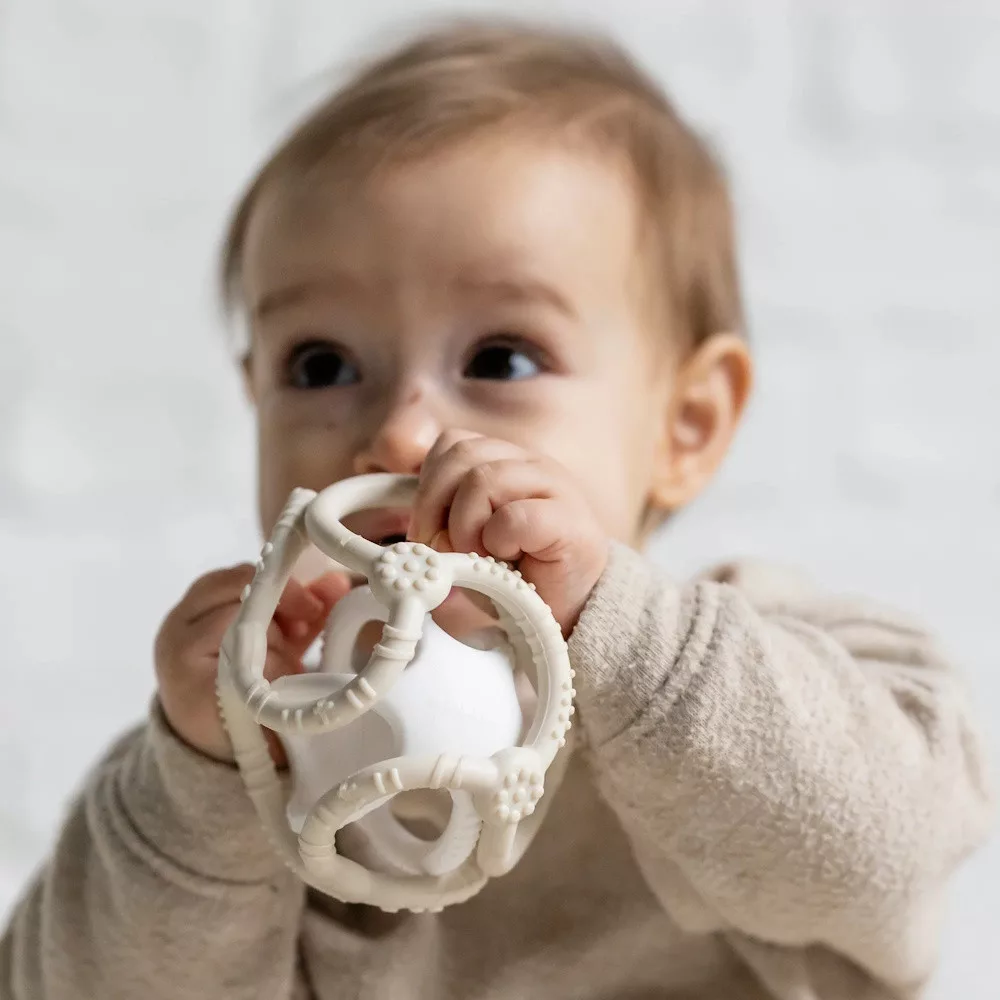 A kétszínû szilikonlabdák egyszerre rágókák és csörgõk: puha rágókaként a babákat és a kisgyermekeket az elsõ fogaik megjelenéséig kísérik. Az érdes felület gyengéden masszírozza az ínyt és enyhíti a kellemetlen fogfájást. Csörgõként a két golyó ideális méretû a kis kezek és ujjak számára. A sok lyuk, az egyes elemek és a különbözõ textúrák szórakoztató játékot biztosítanak, és segítenek a tapintásérzék fejlesztésében. A szilikongolyók egymásba helyezhetõk, és egyaránt praktikus társak és szórakoztató játékok otthonra és útközben is.