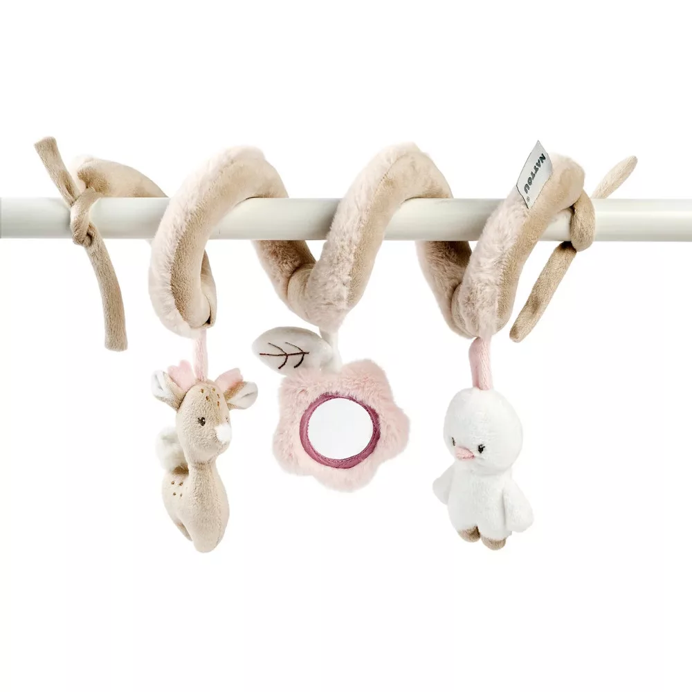 Ez a Nattou puha játékos spiráljáték ideális társ a babádnak otthon és útközben is. A vidám figurák csörgõvel, nyikorgással és gyûrött papírral felkeltik a kíváncsiságot, és arra ösztönzik a kis kezeket, hogy megragadják és felfedezzék õket. Így játékosan stimulálódik mind a tapintás, mind a hallás. Rugalmas formájának köszönhetõen a spirál könnyen rögzíthetõ kiságyra, bölcsõre, autósülésre vagy babakocsira. Egy színes kiegészítõ, amely végtelen játékidõt biztosít, és csodálatos babaajándék bármilyen alkalomra.