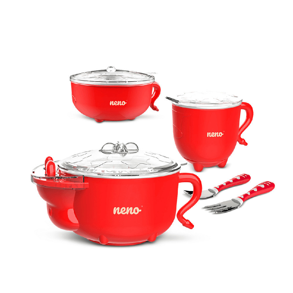 A Neno Mucca étkészlettel minden evés öröm lesz kisbabánk számára. Az étkészlethez tartozik egy tapadókorong, melynek segítségével biztonságosan tudjuk rögzíteni az asztalon, nem fog csúszkálni miközben gyermekünk eszik. Boci formája minden gyermek arcára mosolyt fog csalni, így még nagyobb élmény lesz minden étkezés számukra.ERÕS, CSÚSZÁSMENTES TAPADÓKORONGRendkívül erõs, csúszásmentes tapadókoronggal látták el a tehén alakú tálka alját, hogy megakadályozza az felborulást az asztalon.FÛTÉSI ÉS HÛTÉSI FUNKCIÓAz ételek vízzel való hûtése, vagy melegítése kényelmes, és egészséges megoldás. Ezt könnyedén meg tudod tenni a Neno Mucca táljánál, egyszerûen csak öntsd a vizet a tartályba, annak megfelelõen, hogy melegíteni, vagy hûteni szeretnéd gyermeked ételét.Külsõ anyag: mûanyagBelsõ anyag: kiváló minõségû rozsdamentes acélNagy tálka kapacitás: 350 mlKis tálka kapacitása: 200 mlA csésze kapacitása: 200 mlA készlet tartalma:Nagy tál, kis tál, csésze, villa, kanál, csúszásgátló, vízbetöltõ kupak, nagy szellõzõ fedél, kis fedél, csésze fedél