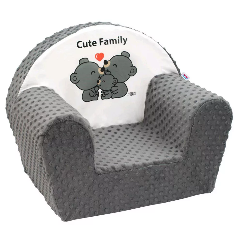 Gyerek Minky fotel New Baby Cute Family Pompás kiegészítõ bútordarab a gyerekszobába. A gyerekek kényelmesen leülhetnek és megnézhetik a kedvenc meséjüket, rajzolhatnak vagy mesekönyvet lapozhatnak. Egy délutáni pihenésre is tökéletes. A fotel nagyon könnyû, ezért az egyik helyrõl a másikra a gyermek is nyugodtan áthelyezheti. A fotel poliutretán habszivacsból készült. A huzata eltávolítható és mosható. Szép színekbe és maci család képpel díszítve. Mérete 42x53 cm, háttámla magassága kb 29 cm, szélessége kb 25 cm. Anyaga: bevonat 100% pamut, belsõ anyaga poliuretán hab.