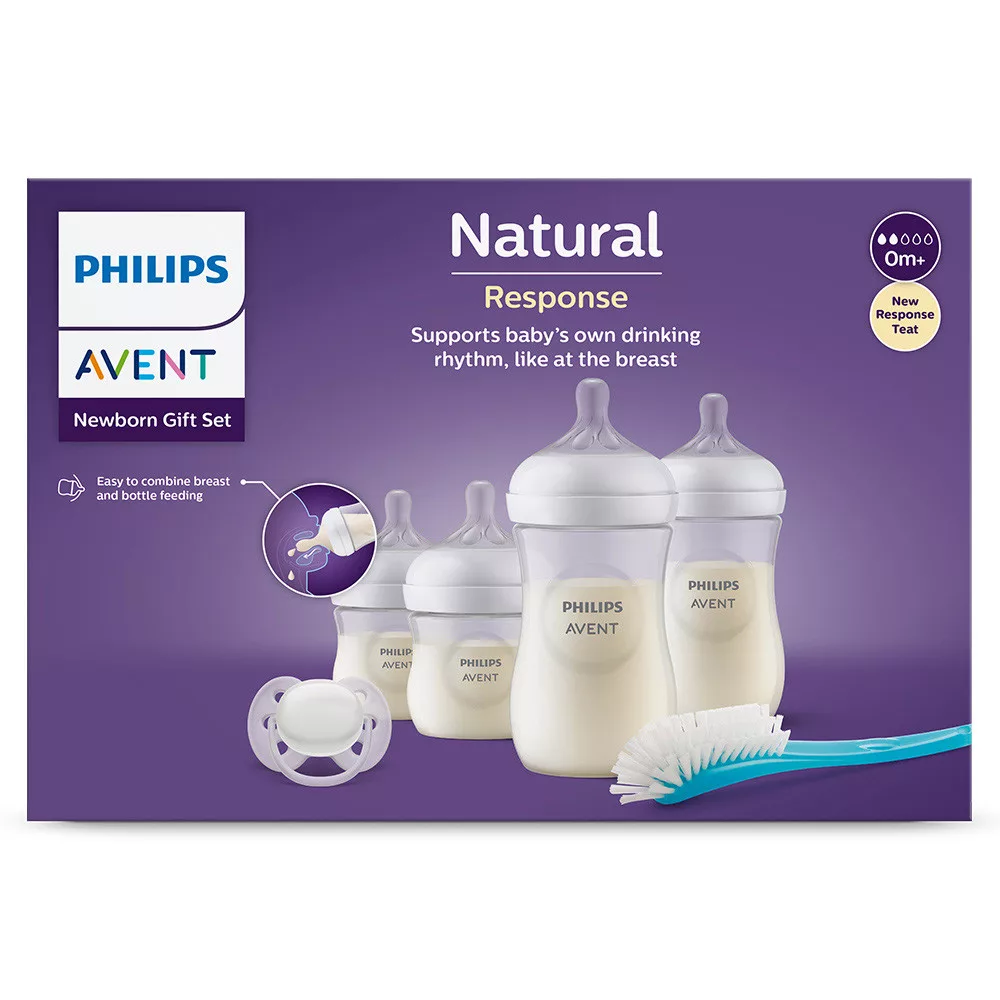 A Natural Response cumisüveg támogatja a baba saját ivási ritmusát, hasonlóan a szoptatáshoz.Az újszülött szett a következõket tartalmazza:- 2x 125 ml-es cumisüveg, 0hó - 2x 260 ml-es cumisüveg, 1hó - 1x Ultrasoft játszócumi- 1x cumisüvegmosó kefeÚj etetõcumi Natural cumisüvegekhez- A Natural Response cumisüveghez való új etetõcumi lehetõvé teszi a baba számára, hogy úgy szopjon, nyeljen és lélegezzen, mintha mellbõl inna.- A szoptatás és a cumisüveges táplálás egyszerû kombinációja- hasfájáscsökkentõ szelep- Cseppmentes, mell alakú kialakítás.- Támogatja a baba természetes ivási ritmusátAz újszülött szett ideális az etetés és megnyugtatás elkezdéséhez. A Natural Response cumi a baba természetes táplálási ritmusával összhangban mûködik, így könnyedén kombinálhatja a szoptatást és a cumisüveges táplálást.A szoptatás és a cumisüveges táplálás egyszerû kombinációja- Természetes szívás a mell alakú etetõcuminak köszönhetõen- Az etetõcumi akkor engedi ki a tejet, amikor a csecsemõ éppen aktívan iszikEgyéb elõnyök- Válassza a baba számára megfelelõ átfolyási sebességet- A csepegésmentes etetõcumival megelõzhetõ, hogy kiömöljön és kárba vesszen a tej- Kompatibilis a Philips Avent termékcsaláddal- Könnyen megfogható a kis kezek számára- Egyszerûen használható, könnyen tisztítható és gyorsan összeállítható- A Natural Response cumisüvegek és etetõcumik BPA-mentesek- Cumisüvegmosó kefe ívelt fejjel a könnyû tisztítás érdekében- Nyugtató Ultrasoft játszócumi a baba érzékeny bõréhez- Legyen türelemmel, amíg a gyermeke megszokja- A szelepnek köszönhetõen a levegõ nem jut be a baba pocakjába- A hasfájás és a kellemetlen érzés csökkentésére tervezveNatural Response etetõcumiA Natural Response cumi a baba természetes táplálási ritmusával összhangban mûködik, így könnyedén kombinálhatja a szoptatást és a cumisüveges táplálást.Az etetõcumi egyedülálló nyílással rendelkezik, amely csak akkor engedi ki a tejet, amikor a csecsemõ éppen aktívan iszik. Vagyis, amikor a baba éppen nyel vagy levegõt vesz, a tejáramlás szünetel.Természetes szoptatásA széles, puha és rugalmas etetõcumi a tervezésénél fogva a mell alakját és érzetét imitálja, ezzel elõsegítve, hogy a baba kényelmesen tudjon a mellre tapadni és enni.Hasfájást csökkentõ szelepA hasfájást csökkentõ szelep a tervezésénél fogva etetés közben megakadályozza, hogy levegõ kerüljön a baba pocakjába, így csökkentve a hasfájást és a kellemetlen érzéseketCsepegésmentes etetõcumiAz etetõcumi nyílása a tervezésének köszönhetõen csak akkor engedi ki a tejet, amikor a csecsemõ éppen iszik. Így elkerülhetõ, hogy kárba vesszen a tej – akár otthon, akár útközbenKönnyen használható és tisztíthatóAz üveg széles nyaka megkönnyíti a cumisüveg feltöltését és tisztítását. Kevés elembõl áll, gyorsan, egyszerûen összeállítható.Könnyû tartaniAz ergonomikus üveget minden szögbõl könnyû megfogni, így maximális kényelmet nyújt etetés közben. Önnek is és az apró kezeknek is könnyû tartani.Ultrasoft játszócumiA hihetetlenül puha, rugalmas forma követi a gyermek arcának vonalát kevesebb benyomódást és bõrirritációt okozva ezáltal kényelmesebb megnyugtatást biztosít.Cumisüvegmosó kefeA speciális, hajlított kefefej és a különleges kialakítású nyél segítségével a széles nyakú cumisüvegek, etetõcumik, tálak és evõeszközök alaposan mosogathatók.Kompatibilis a termékek széles skálájávalKombinálja mellszívóinkat, cumisüvegeinket és poharainkat, hogy az Ön aktuális igényeinek megfelelõ terméket hozzon létre.
