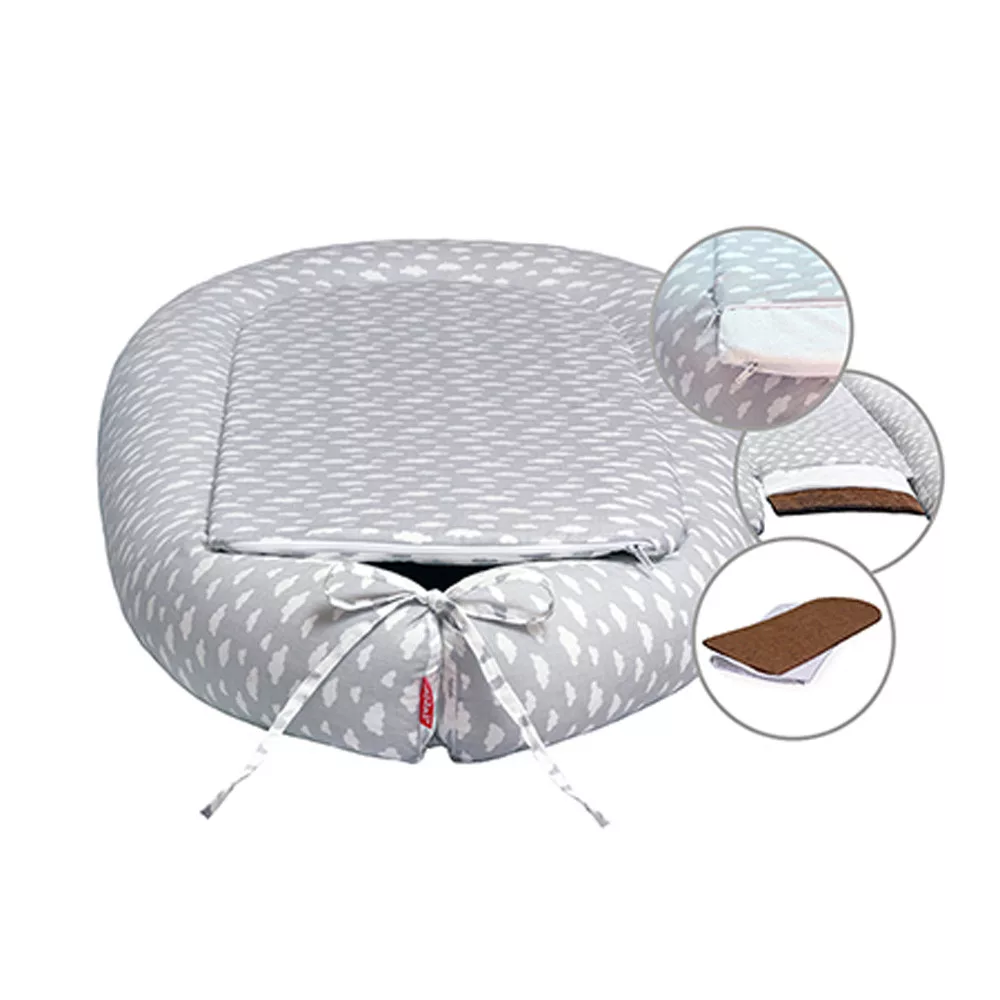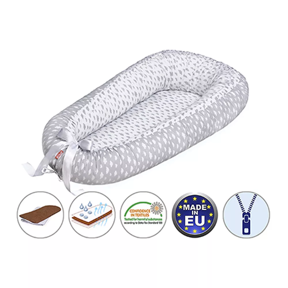 A Scamp babafészek bárhol és bármilyen helyzetben otthonos környezetet biztosít a babának.Egy kis fészek ami körbeöleli a babát, olyan érzést keltve, mintha az anyuka pocakjában lenne.Többfunkciósan használható: - Kiságyban betétként. Az újszülött gyerekeknek nagy és tágas a kiságy, ezért sokkal biztonságosabban érzik magukat a babafészekben, mivel körbeöleli õket. - Szülõk ágyában a nyugodtabb, biztonságos éjszakai alváshoz. - Utazások alkalmával a baba könnyebben alkalmazkodik az idegen környezethez. - Magunk mellé tudjuk venni egyéb elfoglaltságok esetén (konyhában, íróasztalnál). - Pelenkázó asztalon pelenkázásra is használható.Több újdonságot, innovációt építettünk a Scamp babafészekbe:-A fekvõfelületet szivacs helyett latexált kókuszbetéttel készítettük, ami jobb tartást biztosít a fészeknek és egészségesebb is.-a kókuszbetétet frottír anyaggal vontuk be, ami nem engedi át a nedvességet, megvédi a betétet az esetleges szennyezõdésektõl, de a levegõ szabadon tud áramolni. A frottír huzatot cipzárral láttuk el, ezáltal a huzat könnyedén levehetõ, mosógépben mosható.-A fészekbõl a matrac kivehetõ, így a fészek mosógépben mosható.-A babafészek peremét szintén cipzárral láttuk el, így a töltet mennyisége csökkenthetõ vagy tölthetõ.-A jobb tartás érdekében az összehúzószalagon kívül egy plusz kötözõvel is elláttuk a terméket.Méretek:Teljes mérete: 55cm*85cmFekvõfelület: 30cm*70cmMagassága:12cm Anyaga:Huzat:100% pamutvászonFekvõfelület: latexált kókuszPerem töltet: antiallergén, 100% szilikonizált poliészterszálA babafészekhez használt alapanyagok mind bevizsgált termékek. Ökotex 100 tanúsítvánnyal rendelkeznek.Kiegészítõ információk:-A termék a kókuszbetét eltávolítása után 30°C-on klórmentes mosószerrel mosógépben mosható.-A perem töltet mosás során felfrissül, nem csomósodik.-A perem átfordítható, így a fészek mindkét oldalán használható.