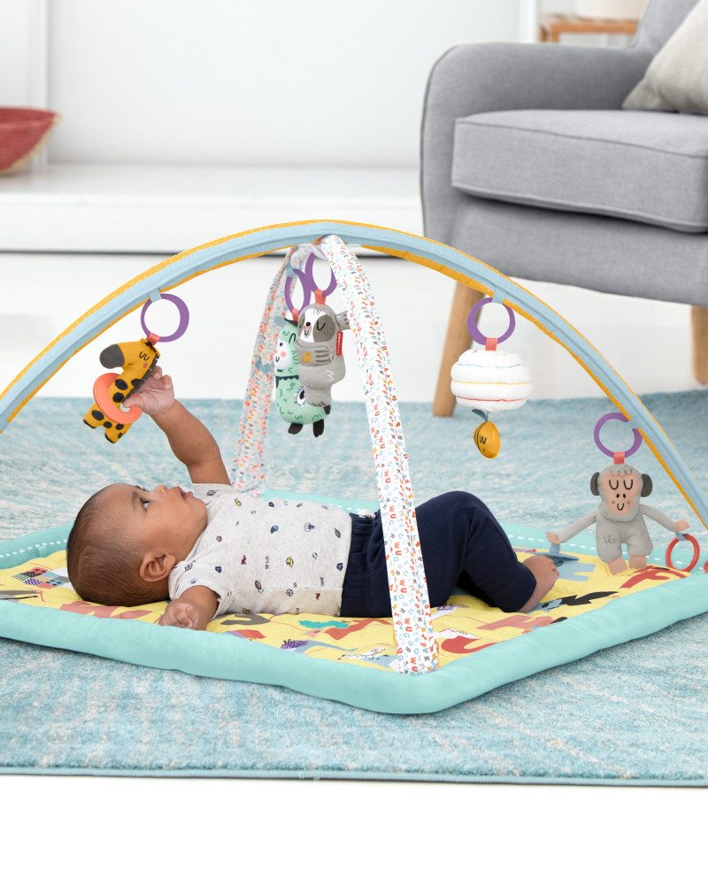 - Az 5 függő játék a következőket tartalmazza: Láma harangjátékkal, Zsiráf ráncokkal és G betűs rágókával, Majom mozgatható karokkal, markoló gyűrűvel és babatükörrel, Peekaboo méhecske, Táncoló lajhár ABC dallal