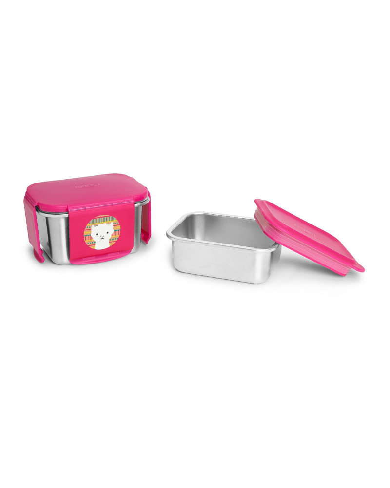 Tulajdonságok: - 3 éves korig ajánlott - két egymásra rakható rozsdamentes acél tartályt tartalmaz biztonságos fedéllel - a fedél szivárgásmentes és könnyen rögzíthető és zárható - az egymáshoz rögzítéséhez rakja egymásra a tartályokat - Skip Hop ZOO® karakterek - BPA mentes - méret (kis tartály): 305 ml; (nagy tartály): 452 ml - mosogatógépben biztonságosan tisztítható - ne rakja mikrohullámú sütőbe