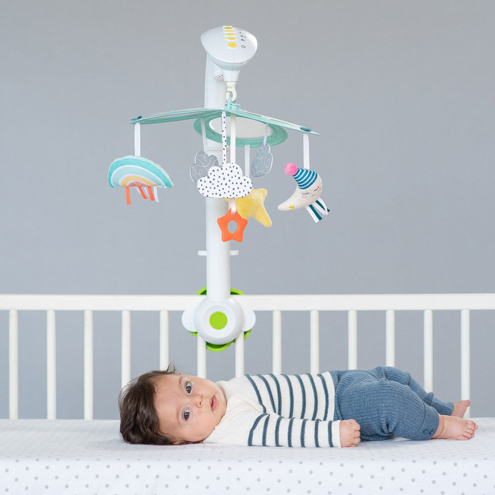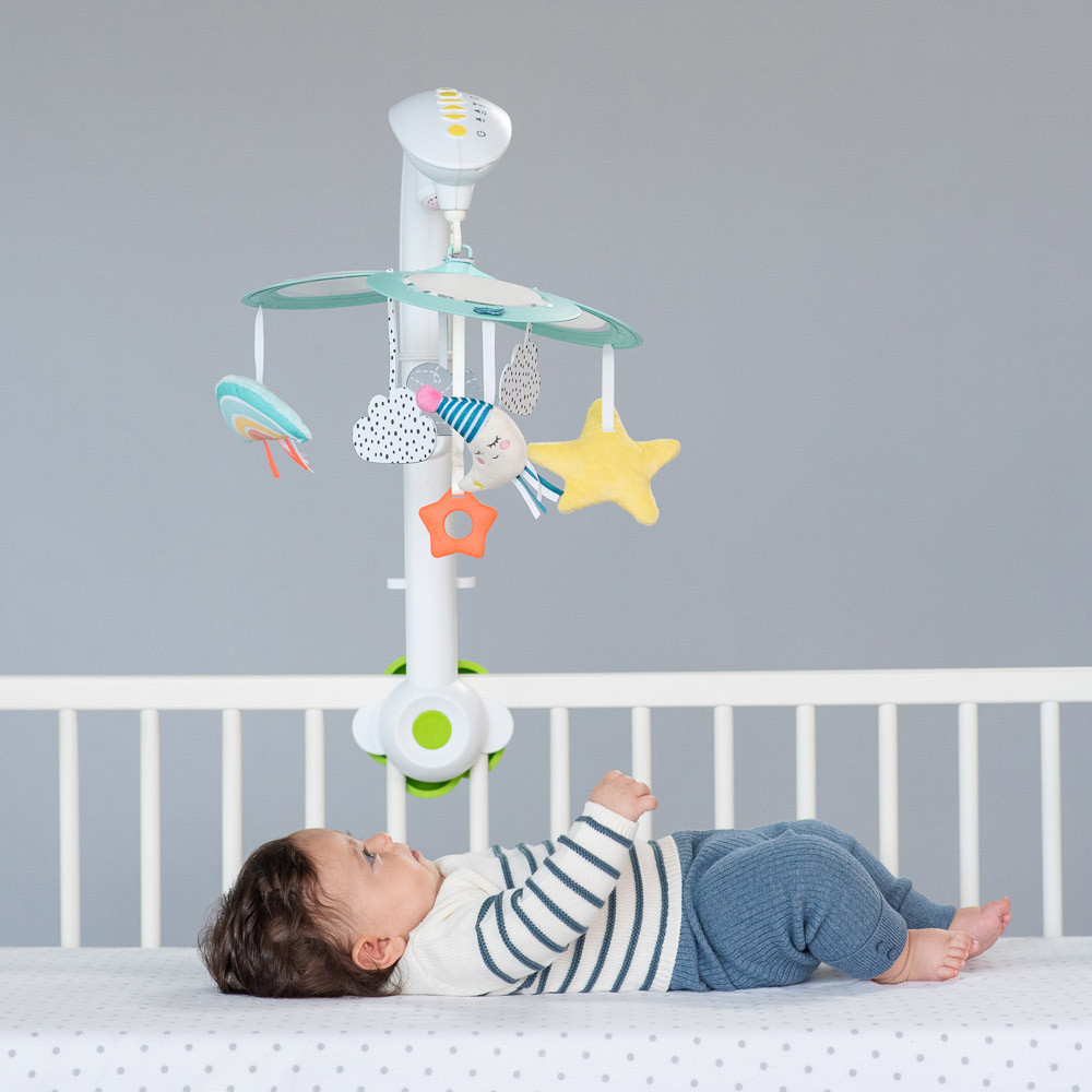 Altassa el babáját akár 30 percnyi gyönyörû, nem ismétlõdõ klasszikus dallamokkal. Ez a stílusos zenélõ-forgó tökéletesen illeszkedik minden gyerekszobába, miközben lenyûgözõ hangot, mozgást és fényt biztosít, hogy elbûvölje és stimulálja a babát.Ideális a baba érzékszerveinek, kognitív készségeinek és érzelmi intelligenciájának fejlesztésére.- 30 perc nem ismétlõdõ klasszikus dallamok Mozarttól, Schumantól, Vivalditól és másoktól, kifejezetten csecsemõknek szerkesztve.- 8 klasszikus dallam világhírû zeneszerzõktõl, kifejezetten babák számára szerkesztve:- Mozart – Aludj kicsi hercegem- Vivaldi – A négy évszak - tél- Bach – Zenekari szvit 3. sz- Field – Noktürn- Csajkovszkij – Évszakok - június- Chopin - Noctürn Op.9 Nr. 2- Schumann – Kinderszenen - jelenetek a gyerekkorból- Elgar – SaluteA kiságy fölött forgó világoskék lombkoronára csillagformákat vetít.A hang-, fény- és mozgásvezérlés a zenélõ-forgó kar tetején található.A zene, a mozgás és a fények kombinációja megnyugtatja a babát, és segít fejleszteni az újszülött érzékszerveit, kognitív készségeit és érzelmi intelligenciáját.Elem: 4 X AA (nem tartozék)Biztonsági tesztelve megfelel az ASTM, CPSIA, EN71 és a vonatkozó biztonsági szabványoknak, vagy meghaladja azokat.Újszülött kortól ajánlotthttps://youtu.be/p0nnOq2sEdY