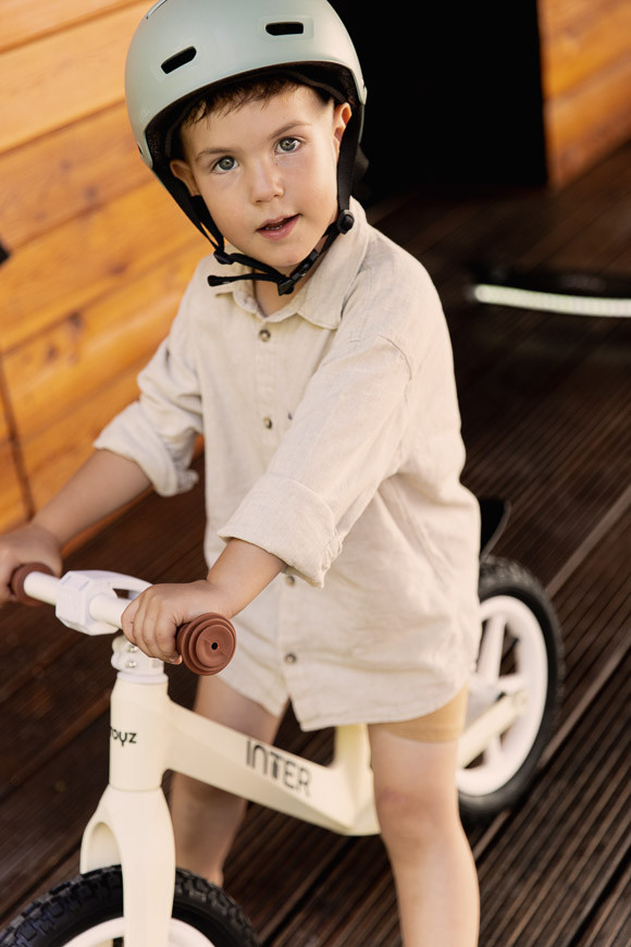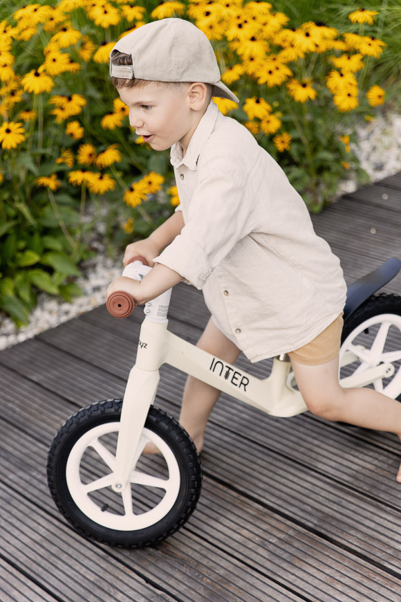 A futóbicikli megjelenése igazán szerethető: a finom pasztell árnyalatok és a meleg barna részletek harmonikus, esztétikus összhatást teremtenek. Az Inter nemcsak praktikus, hanem stílusos darab is, amely első pillantásra kitűnik a hétköznapi modellek közül.