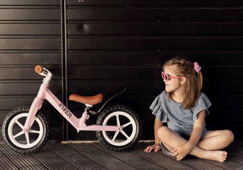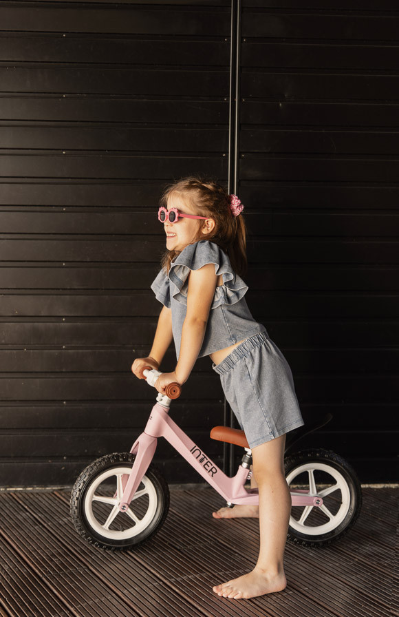 A futóbicikli megjelenése igazán szerethető: a finom pasztell árnyalatok és a meleg barna részletek harmonikus, esztétikus összhatást teremtenek. Az Inter nemcsak praktikus, hanem stílusos darab is, amely első pillantásra kitűnik a hétköznapi modellek közül.