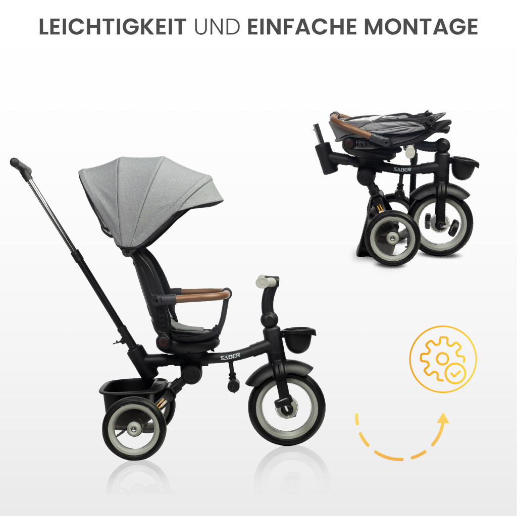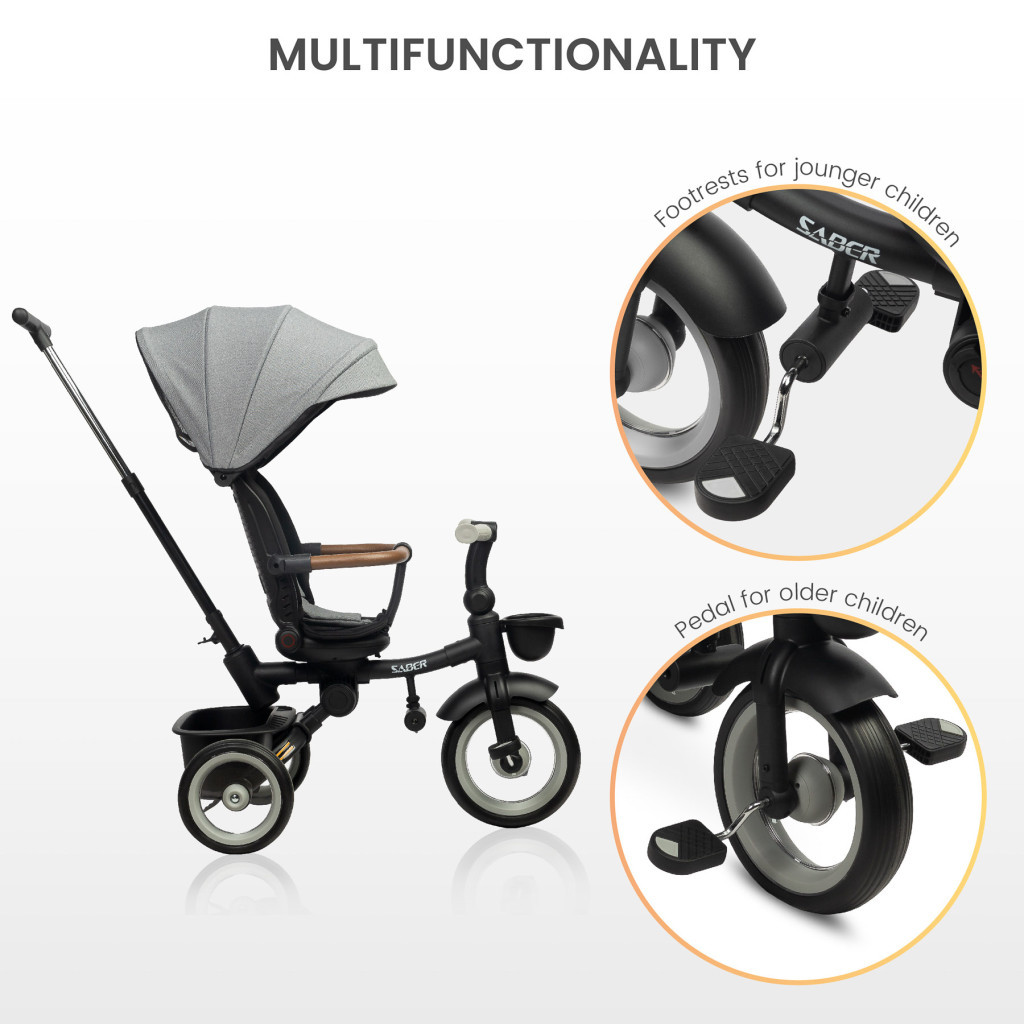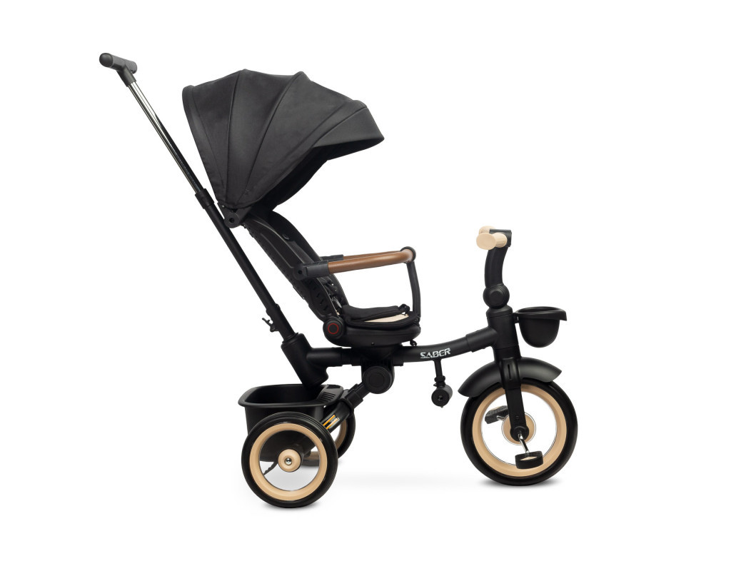 A Saber márkánál a kényelem és a biztonság elsődleges szempont. A hárompontos biztonsági öv és a védőkar biztonságos játékot és nyugodt alvást biztosít a gyermek számára a séták során. A fényvisszaverő matricák és az első LED-lámpa növelik a láthatóságot esti séták közben.