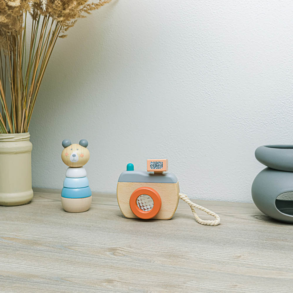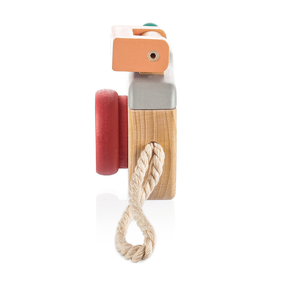 A játék könnyû és kompakt méretû, így kényelmes a kézben. A fényképezõgép fix hevederrel van felszerelve a könnyû szállítás és kezelés érdekében. A játék tetején van egy nagy gomb, amely megnyomására hangot ad ki. A fából készült kamerával a gyerekek megtanulják fejleszteni a képzeletet, a kreativitást és javítják a motoros funkciókat.- Kamera kialakítás- Az exponáló gomb hangot ad ki- Kompakt méretek- Hordozóheveder- Fejleszti a kreativitást, a képzelõerõt és a motoros készségeket- Minõségi tartós fából és vízbázisú festékekbõl készült