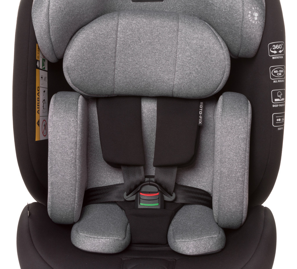 A Roto-Fix i-Size megfelel az R129 / i-Size előírásoknak, amelyek a legmagasabb biztonsági normákat képviselik Európában. Az ISOFIX és Top Tether rögzítés, a masszív váz és az energiaelnyelő szerkezet együtt garantálják a gyermek maximális biztonságát minden helyzetben.