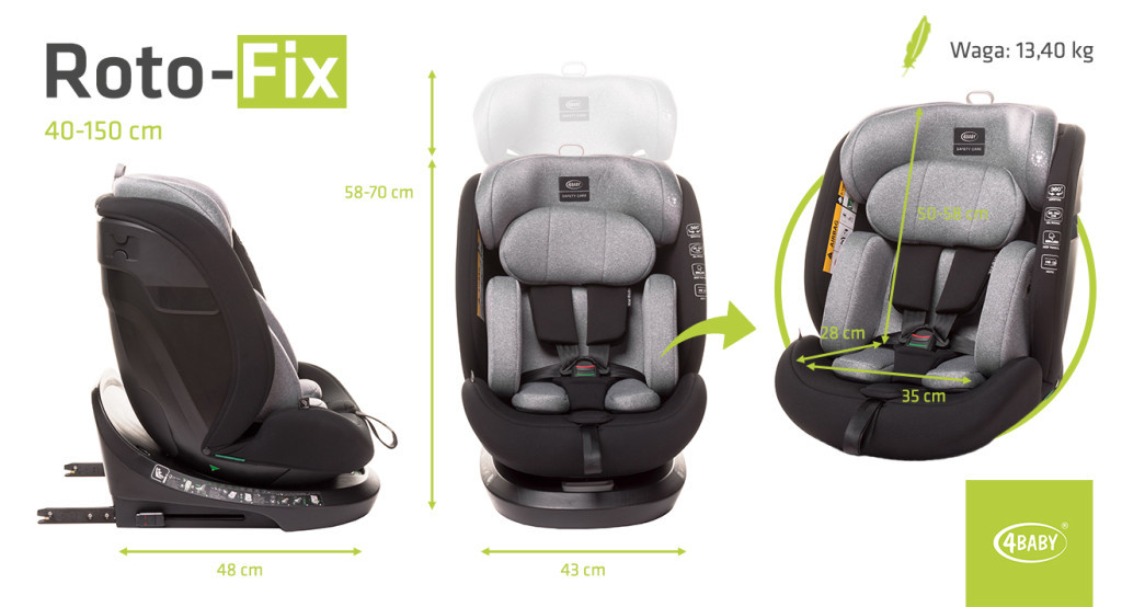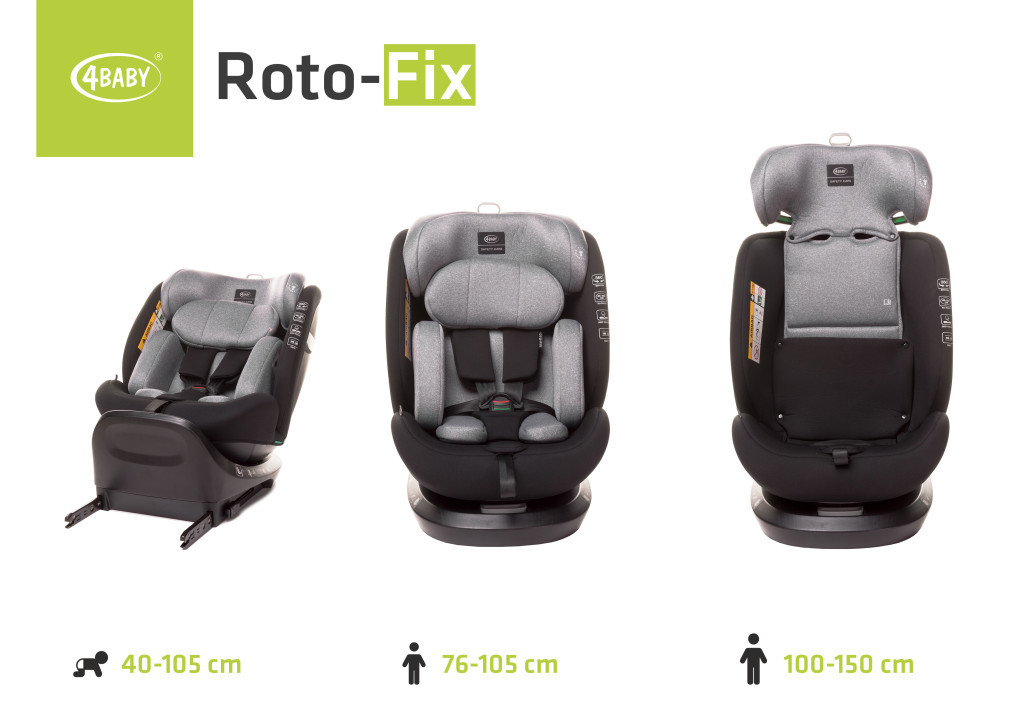 A 4 Baby Roto-Fix i-Size autósülés a modern technológia és a maximális biztonság tökéletes kombinációja. Az ülés a legújabb ECE R129 (i-Size) szabványnak megfelelően készült, és 40–150 cm közötti testmagasságú gyermekek számára alkalmas – az újszülött kortól egészen kb. 12 éves korig.