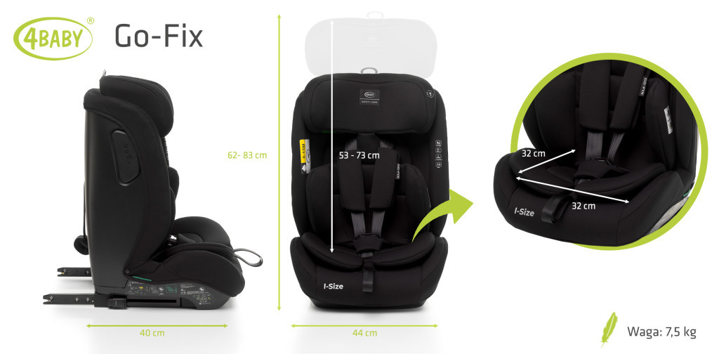 A 4Baby Go-Fix i-Size autós gyerekülés a modern technológia és az intelligens tervezés tökéletes kombinációja. Az i-Size (R129) szabványnak megfelelő kialakítás garantálja a legmagasabb szintű védelmet és kényelmet a 76 és 150 cm közötti gyermekek számára – azaz körülbelül 3 és 12 éves kor között.