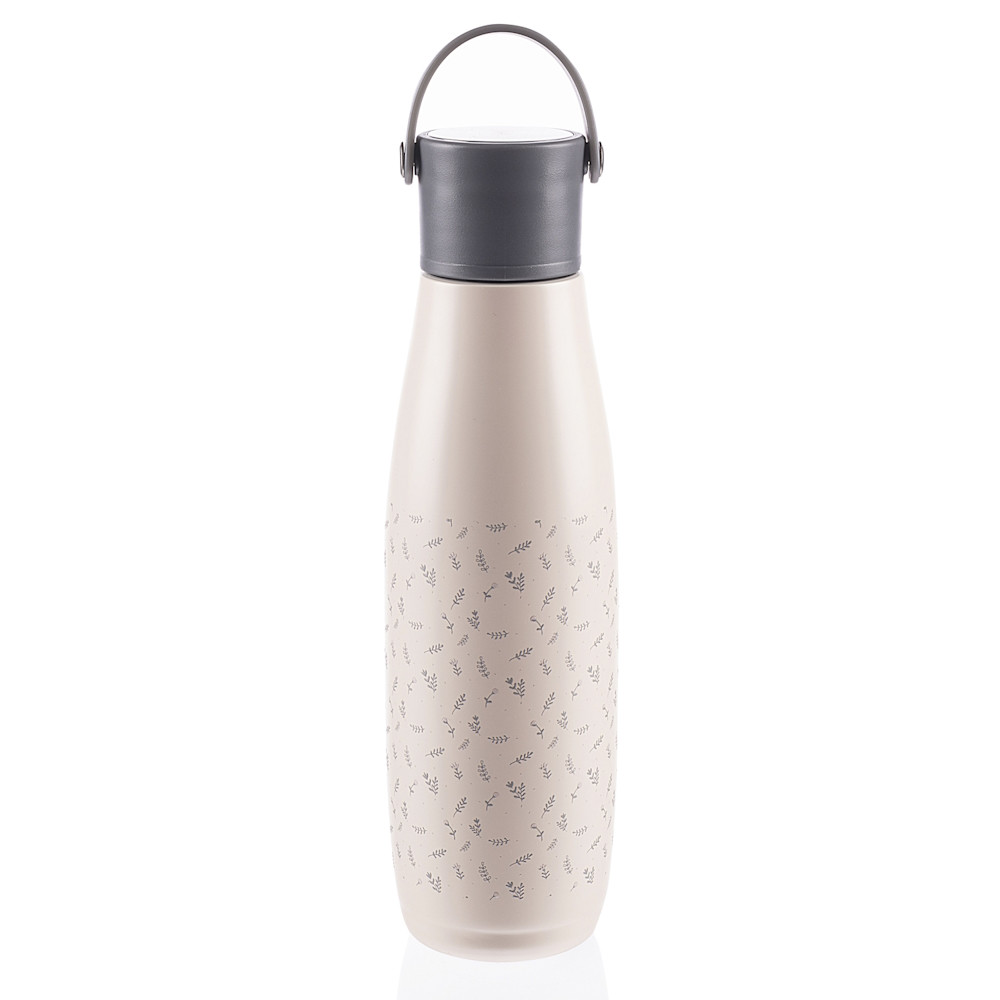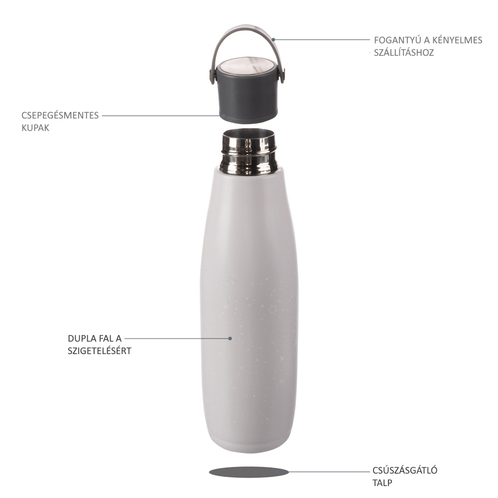 Hideg és meleg italok tárolására alkalmas, minõségi rozsdamentes acél, korrózió- és páralecsapódásálló, szoros kupak, akasztó, ûrtartalom 480 ml.A kiváló minõségû 480 ml-es ital termoszban a forró italok akár 12 órán át, a hideg italok pedig akár 24 órán keresztül is tárolhatók. Kiváló minõségû rozsdamentes acélból készült, amely ellenáll a korróziónak. A szorosan záródó fedél biztosítja, hogy a termosz ne szivárogjon. A vákuumszigetelésnek köszönhetõen a termosz kívülrõl nem melegszik fel forró folyadékkal megtöltve. A kényelmes fogás érdekében a termosz szilikon akasztóval van felszerelve.Társ minden utazáshozA mûanyag kulacsokhoz képest a rozsdamentes acél anyag nem szívja fel a szagokat és foltálló. Ráadásul szállítás közben sem szivárog ki a folyadék, ahogyan egyes mûanyag kulacsokból vagy itatópoharakból, amik nem zárnak jól.A folyadékokhoz való termosz használatával segítesz csökkenteni a mûanyagfogyasztást. A termosz kézzel mosható, mosogatógépben nem mosható.Tulajdonságok:- 480 ml ûrtartalom- Alkalmas hideg és meleg italokhoz- Szorosan záródó fedél (csepegésmentes)- Kiváló minõségû rozsdamentes acél- Vákuumos szigetelés- Akár 12 órán keresztül melegen tartja a tartalmat- Akár 24 órán keresztül hidegen tartja a tartalmat– BPA mentes- ECO-friendly- 25 cm magas- súlya: 310g- átmérõje: 7 cm