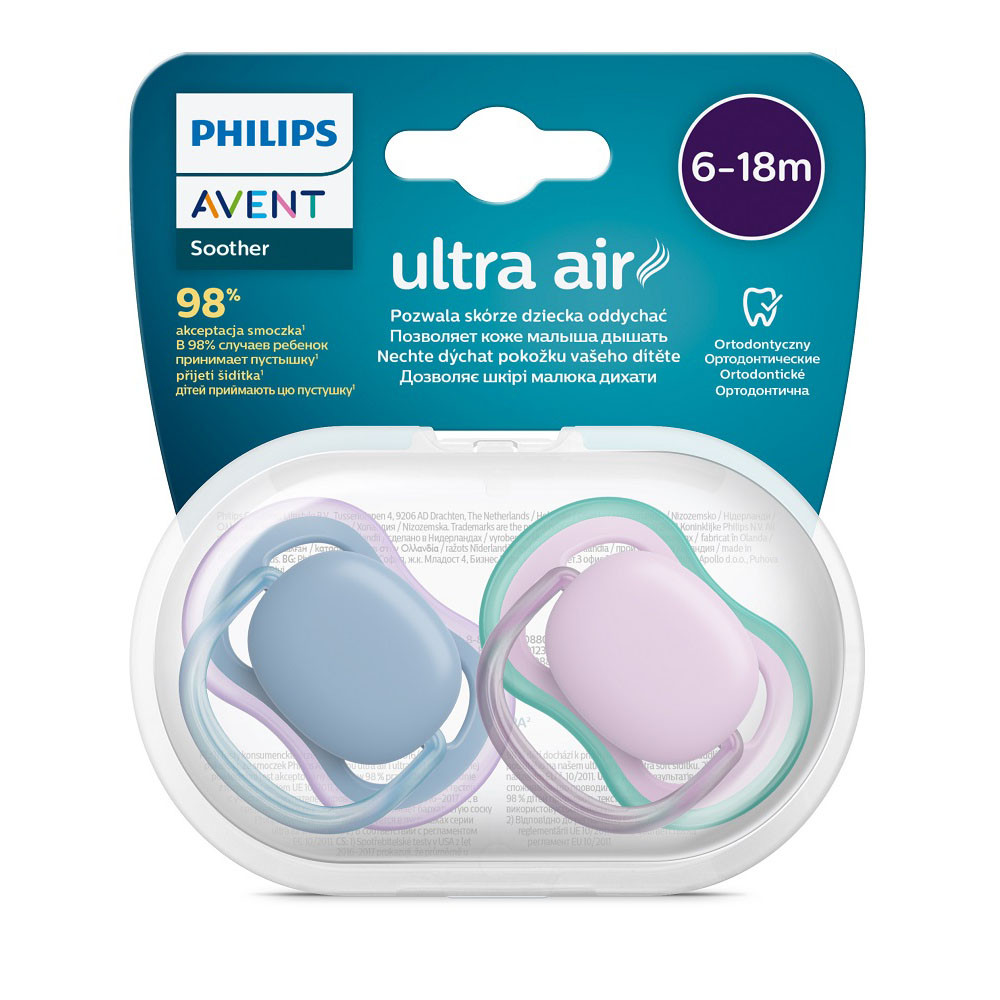 Hagyja a baba bõrét lélegezni. Extra nagy levegõnyílások a kényelmesebb megnyugtatás érdekében.A levegõ kellemességével biztosít megnyugvást. A Philips Avent ultra air cumi extra nagy levegõnyílásokkal rendelkezik, így a baba bõre száraz marad. Különféle színekben és kivitelekben kapható.Tulajdonságok:- Sterilizálás és tárolás egyetlen praktikus tokban- Kényelmes sterilizálás 3 perc alatt- Szellõzés és megnyugvás- Biztosítja a baba bõrének légzését- Kényelmesen puha, bársonyos cumi- Extra erõs cumifej- A játszócumi 100% szilikonból készült- A szájüreg természetes fejlõdése- Garantált minõség- Hollandiában tervezték és gyártottákBiztosítja a baba bõrének légzésétAz extra nagy levegõnyílások szellõztetik a baba bõrét, így az szárazabb marad cumizás közben.Extra erõs cumifejAz extra erõs cumifej illeszkedik a szájpadlás, a fogak és az íny természetes alakjáhozA játszócumi 100% szilikonból készültSzándékosan választottuk a szilikon anyagot az Ultrasoft és Ultra air játszócumikhoz, mert ez egy biztonságos és inert anyag, amelyet gyakran használnak az orvosi gyakorlatban, és amely mentes a veszélyes vegyi anyagoktól, endokrin aktív összetevõktõl (pl. BPA) és allergénektõl.Fogszabályozós játszócumiOrtodontikus, szimmetrikus és puha szilikon cumijainkat úgy terveztük, hogy biztosítsák a szájpadlás természetes fejlõdését.Természetes a baba számáraTexturált szilikon cuminkat úgy terveztük, hogy hasonlítson az anya mellére.3 perc alatt sterilizálhatóAz Ultrasoft és Ultra air cumijainkhoz mellékelt utazótok egyben sterilizálóként is szolgál. Csak öntsön bele vizet, és tegye be a mikrohullámú sütõbe Nyugodt lehet afelõl, hogy tiszta és használatra kész lesz a következõ alkalomra.Hollandiában készültUltrasoft és Ultra air játszócumijainkat Hollandiában tervezték és gyártják.- Fontos! A termék egészségvédelmi és higiéniai terméknek minõsül. Amennyiben a csomagolás felbontásra került, vagy a kipróbálás jelei látszódnak a terméken, úgy a 14 napos elállási jog érvényét veszíti a 45/2014. (II. 26.) korm. rendelet 29. § (1) bekezdése alapján.