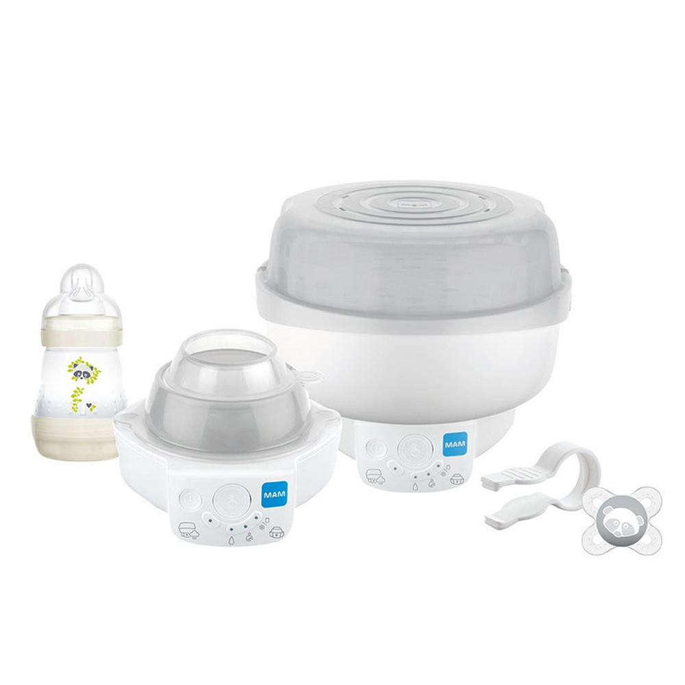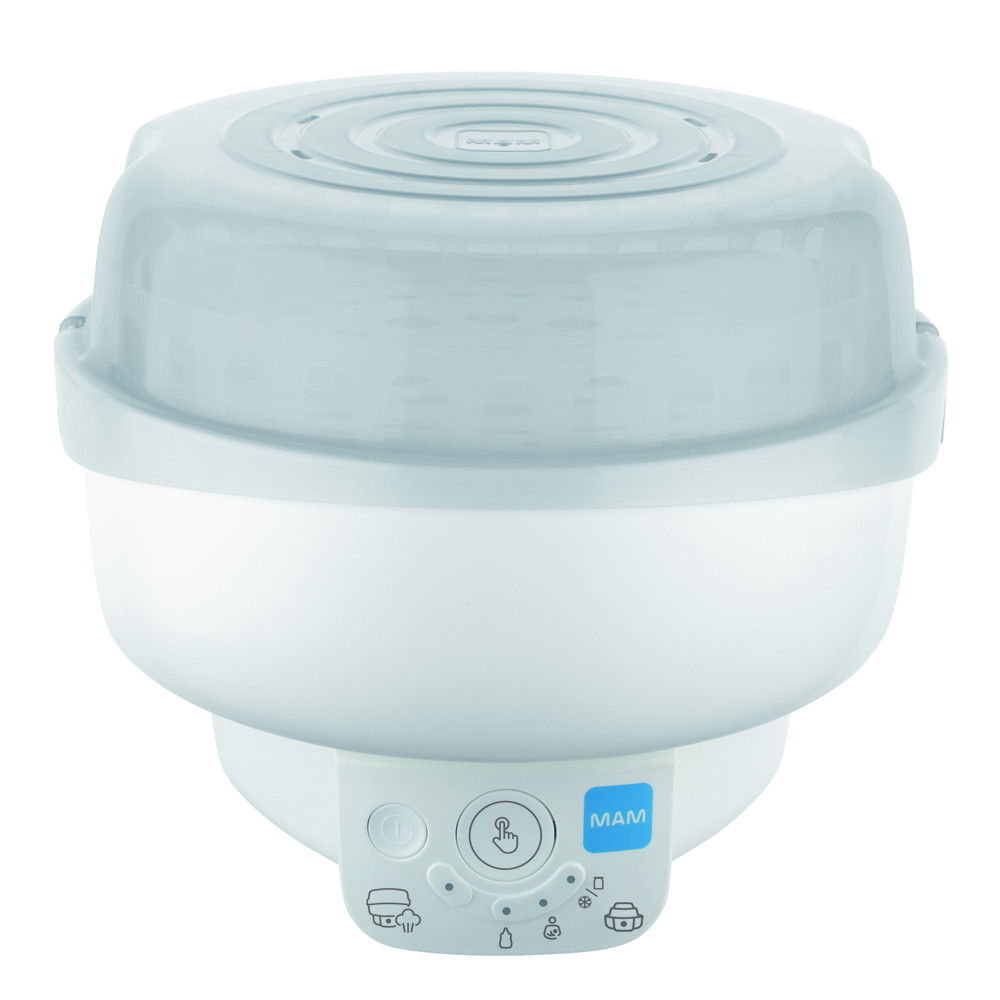 A melegítés és a sterilizálás még sosem volt ilyen egyszerû. A MAM Elektromos sterilizáló és expressz cumisüveg-melegítõ 6 újszerû funkcióval rendelkezik 1 készüléken belül.Kompakt sterilizáló és melegítõ megoldás, amely kevesebb helyet foglalElektromos és mikrohullámú gõzös sterilizáláshoz is használható. Akár 48 óráig sterilen tartja a tárgyakatxKíméletes és gyors melegítés: anyatejhez és tápszerhez tökéletesA megkérdezettek 94%-axx (inkább) elégedett a MAM Elektromos sterilizáló és expressz cumisüveg-melegítõvel10-bõl 9 megkérdezettxx ajánlaná a MAM elektromos sterilizálót és expressz cumisüveg-melegítõt másoknakA mikrohullámú sterilizáló 650 és 1850 watt közötti teljesítményû mikrohullámú készülékekben használhatóAjándék a csomagban: 1x Anti-Colic 160 ml-es cumisüveg, 1x MAM Start cumi, 1x szívókafogóx Legfeljebb 6 MAM cumisüveg és 5 cumi fertõtlenítésére alkalmas. A további részletekért nézze meg a használati utasításban található táblázatot. Az 5 perces idõtartam mikrohullámú készülékben, 1850 W teljesítményen értendõ.
